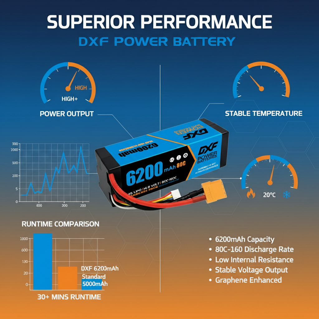 The DXF 4S 14.8V 6200mAh 80C Hardcase LiPo battery delivers exceptional performance and reliability for serious RC enthusiasts. Engineered with advanced hardcase pack technology, this premium battery provides the explosive power and sustained energy your 1/8 and 1/10 scale vehicles demand.